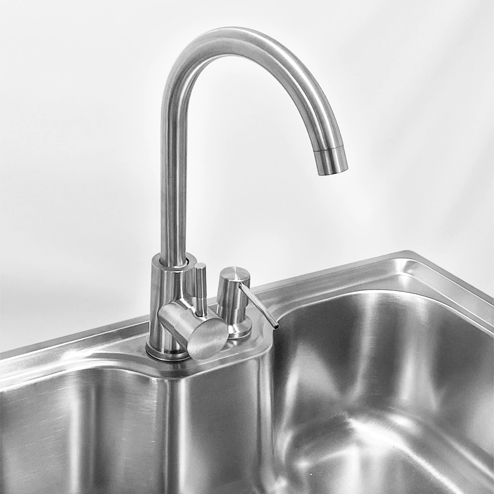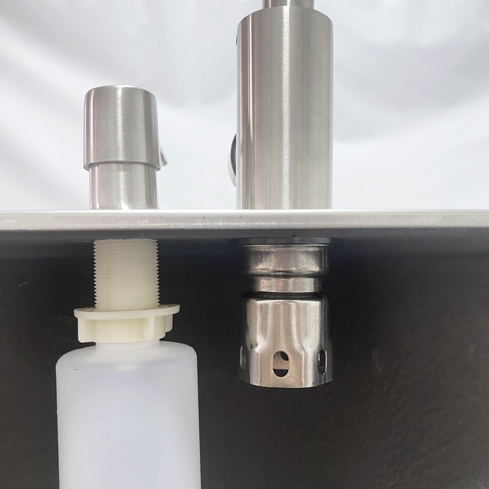 -Doble perforación con tapón en acero inoxidable aptas para grifería monocomando (3,2cm diámetro) y dispenser de detergente (2,8cm).