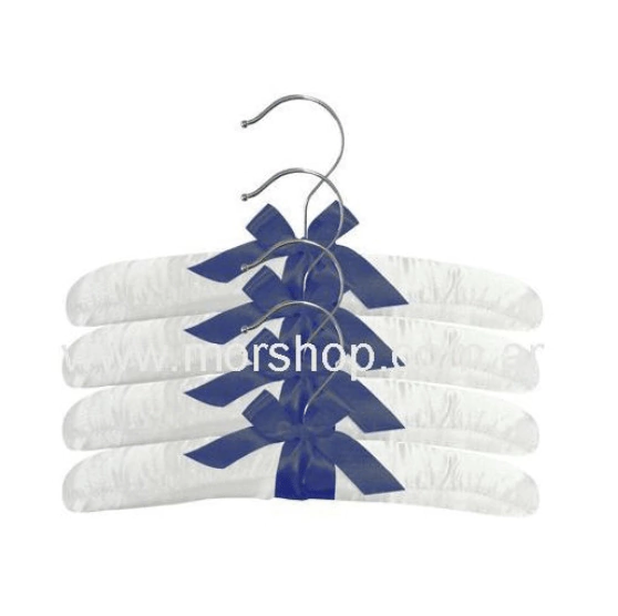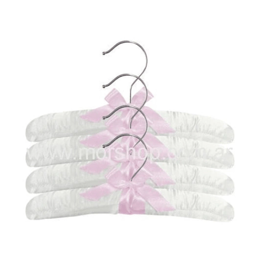 Percha forrada para bebe. Confeccionada en forma artesanal en madera y tela satinada, con gancho cromado. Varios colores.