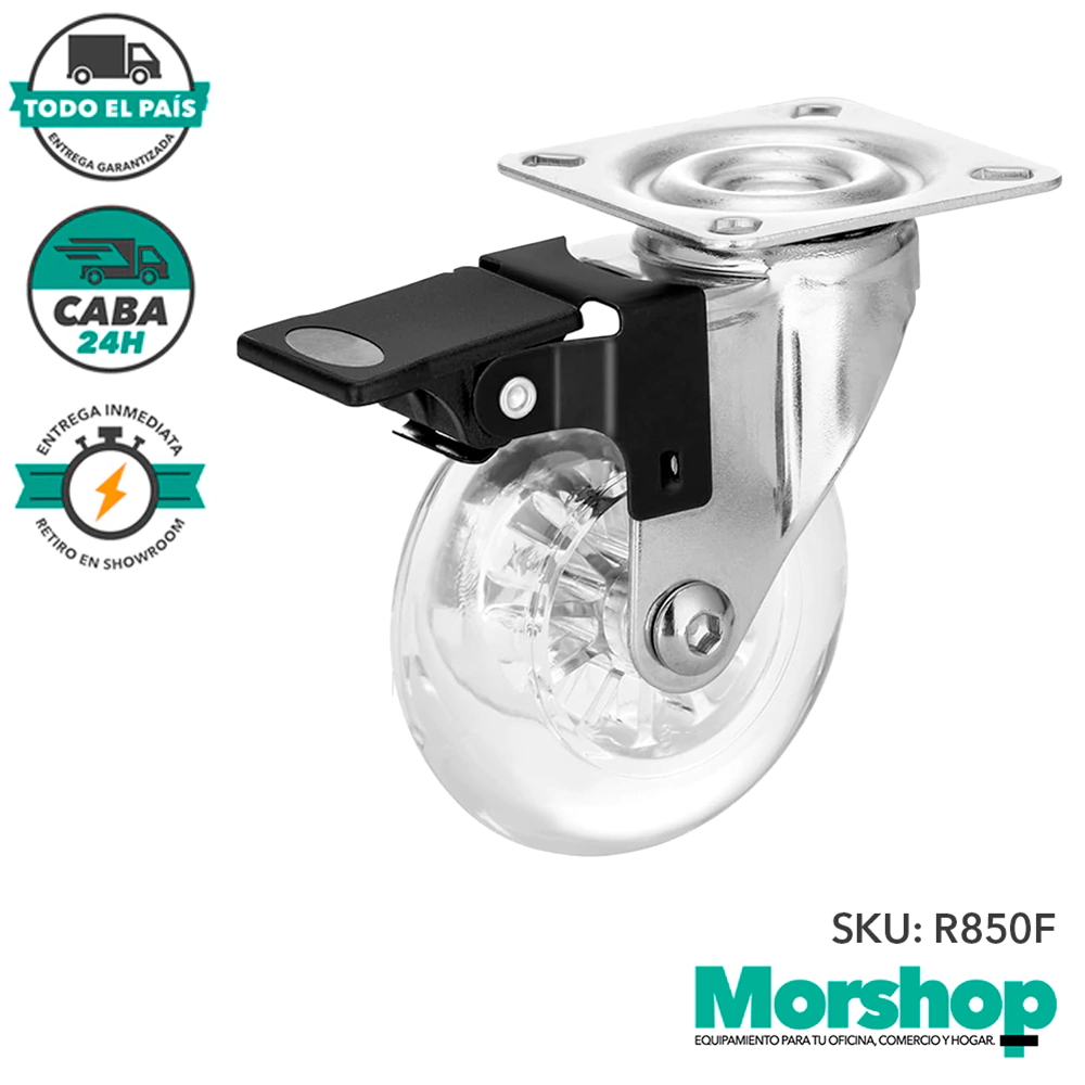 Ruedas giratorias transparente con freno, ideal para muebles pequeños, macetas, cajoneras, etc. En un solo movimiento frena rueda y giro.
