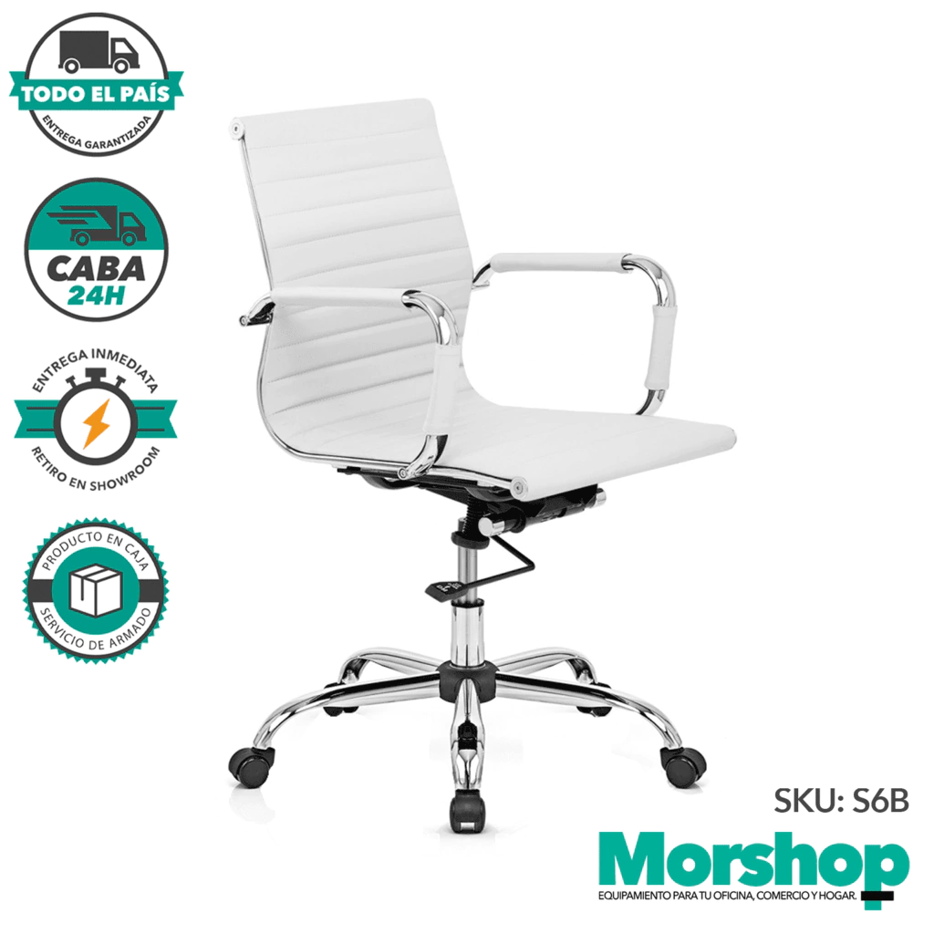 Silla Ejecutiva con respaldo bajo y base cromada. Tapizado de Ecocuero color Negro, fácil de limpiar. Diseño Charles Eames. Sistema basculante con regulación neumática en altura.