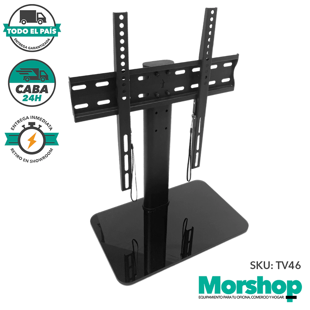 Soporte TV tipo rack con base de vidrio para colocar en mesas, muebles, vidrieras, etc. Se adapta a cualquier tipo de espacio, por su diseño moderno y sofisticado.